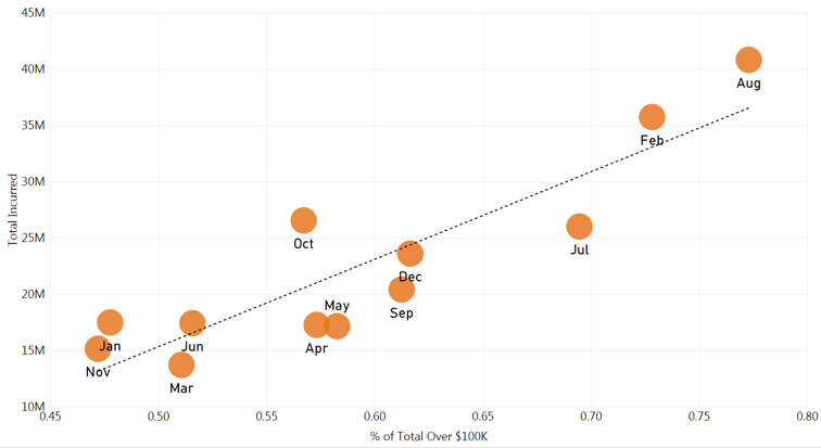 This graph shows that there is a strong correlation between how much a month incurs and how much of that incurred is from large accidents (defined as over $100K).