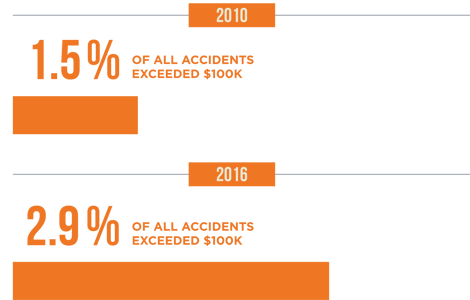 And now, it's far easier to run a claim over $100k than ever before. From 2010 to 2016, the percentage of claims that exceeded $100k nearly doubled.